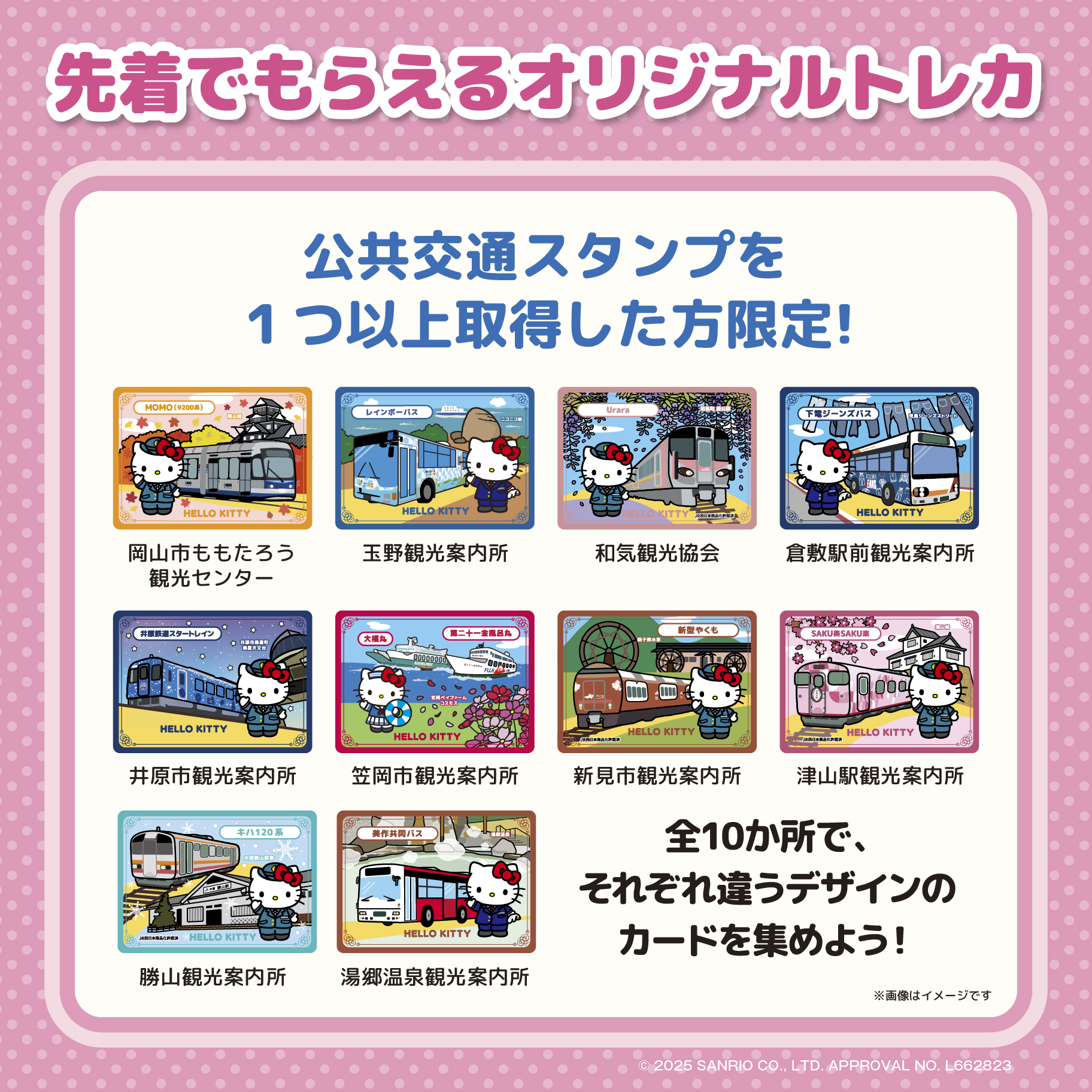 対象の電車、バス、フェリーに乗って、1つ以上公共交通スタンプを集めると、ハローキティと岡山の公共交通がコラボレーションした限定ノベルティカードがもらえる!